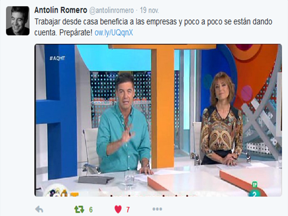 Día viernes, 19 de noviembre. Sobremesa. Twitter. Lectura. Leo un Tweet de Antolín Romero de Aquí Hay Trabajo… sobre el teletrabajo, joder, yo paso muchas horas trabajando en el despacho de casa, a ver…