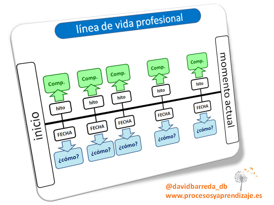 La línea tendrá el inicio que tú quieras, y recogerá aquellos puntos claves de tu vida profesional. Ojo, esto no es un Curriculum, no me estoy refiriendo a eso, es una ruta, tu propia ruta de profesional con todos aquellos sitios por los que has pasado y con todos los hitos bien marcados. El final lo determinará tu momento actual.