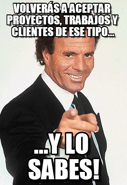 Cuando te ganas la vida por cuenta propia y a eso le sumas que te encanta lo que haces a veces te descubres autoconvenciéndote para participar en un proyecto, trabajo o atender a un cliente dándote motivos que ni tú mismo te crees… lo cierto es que entre “el hambre” y “las ganas” te acabas dejando seducir y manteniendo situaciones en las que no terminas de estar cómodo (por llamarlo de alguna manera). Ojo, porque el coste puede acabar siendo más alto de lo que imaginabas, y ya no hablo solo de lo económico, hablo también de la “resaca emocional” que te espera después de “la fiesta”.