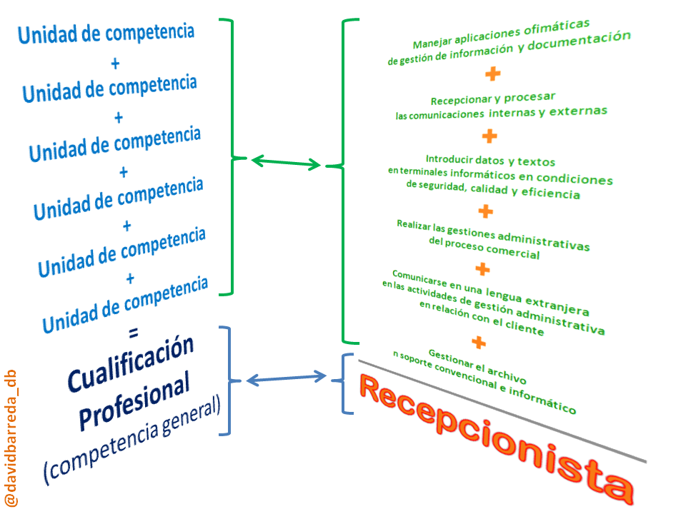 Por otro lado, esta competencia general se divide en “unidades de competencia”, o dicho en otras palabras, en cada una de las funciones que hay que desempeñar en esa ocupación (te remito otra vez al dibujo, en el que aparecen las 6 unidades de competencia que definen la competencia general de recepcionista).